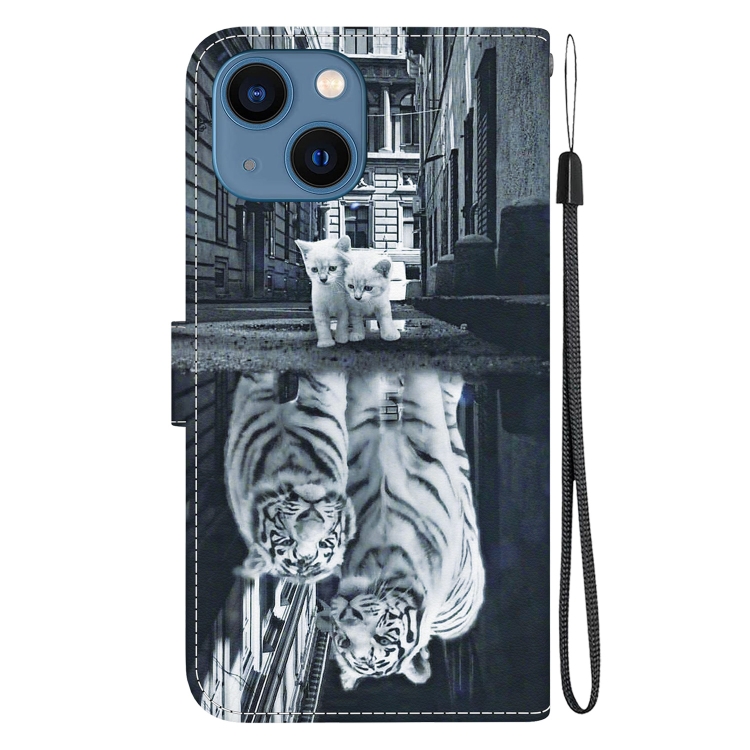For iPhone 13 mini Crystal Texture Colored Drawing Leather Phone Case (Cat Tiger Reflection)