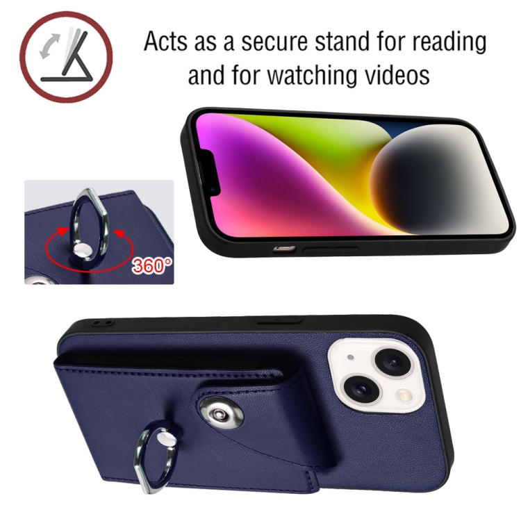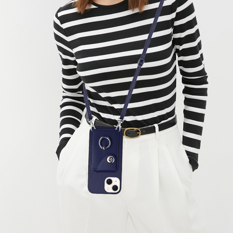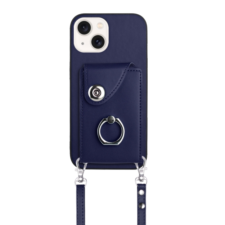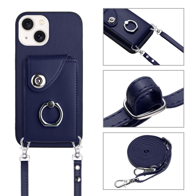 For iPhone 13 mini Phone Case with Ring Holder and Organ Card Bag with Long Lanyard (Blue)