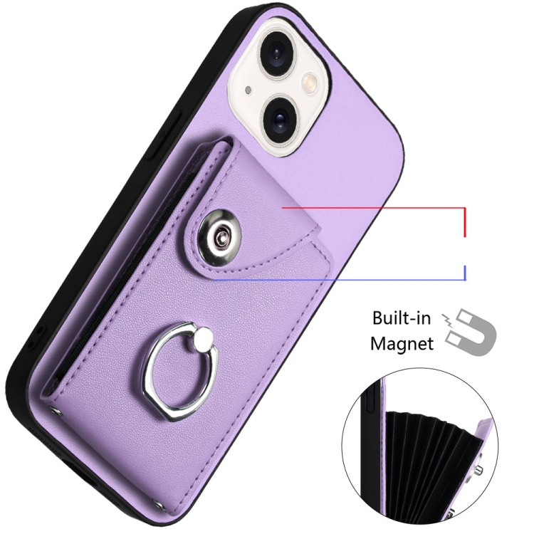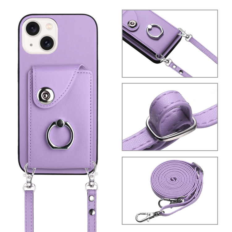 For iPhone 13 mini Phone Case with Ring Holder and Organ Card Bag with Long Lanyard (Purple)