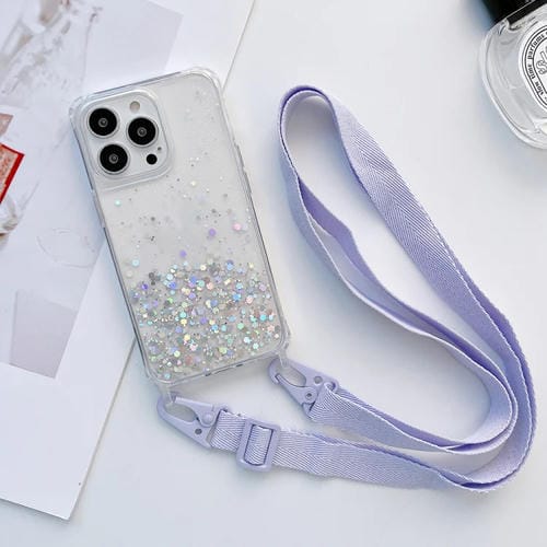 Funda para iPhone 13 Mini Lanyard Glitter Epoxy Clear Phone Case (Púrpura)
