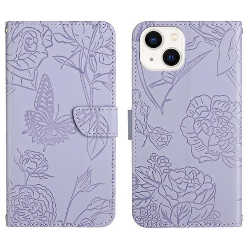 Funda para iPhone 13 Mini Skin Feel Butterfly Peony Cuero en Relieve (Púrpura)