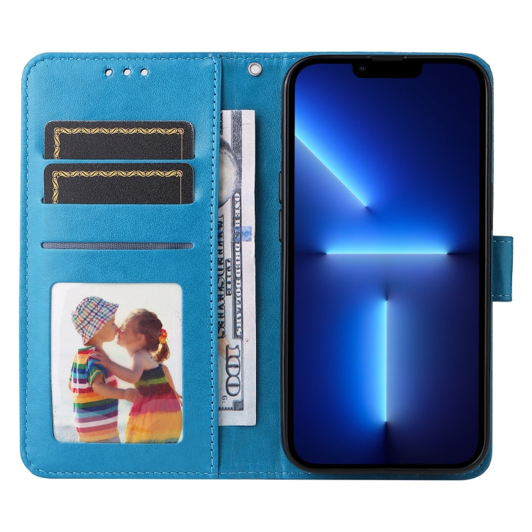 Estuche para teléfono iPhone 13 Pro cuero con estampado de girasol en relieve (Azul)