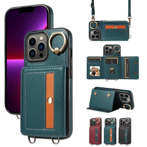 Funda de Cuero para iPhone 13 Pro con Soporte para Anillo y Bolso Cruzado para Tarjeta (Verde)