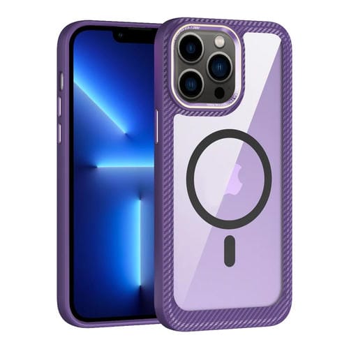 Caja de Teléfono para iPhone 13 Pro Magsafe con Panel Posterior Transparente de Fibra de Carbono (Púrpura)