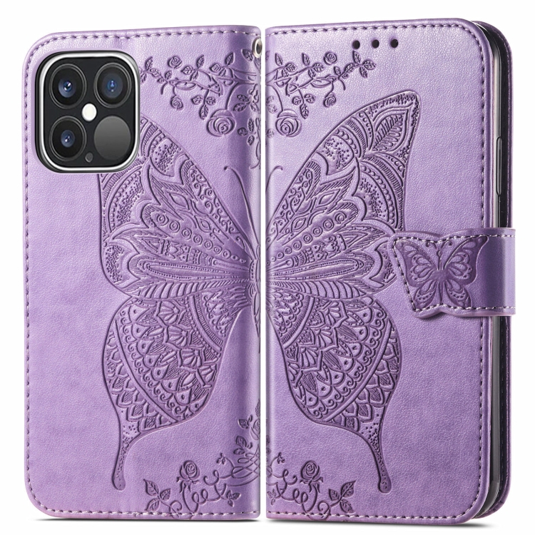 Estuche de Cuero para iPhone 13 Pro Max Butterfly Love Flower con Tapa Horizontal En Relieve Soporte Ranura Tarjeta Billetera Cordón (Púrpura Claro)