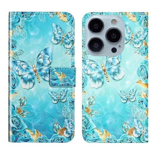 Funda para Teléfono iPhone 13 Pro Max Cuero Dibujo 3D En Relieve al Óleo (Mariposas Azules)