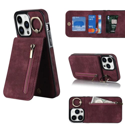 Estuche para Teléfono iPhone 13 Pro Max Retro Ring and Zipper Ranura para Tarjeta Rfid (Rojo Vino)