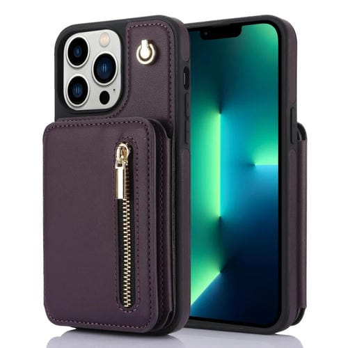 Estuche para teléfono Ym006 para iPhone 13 Pro Max con bolsa para tarjetas, cremallera y cordón doble (Púrpura Oscuro)