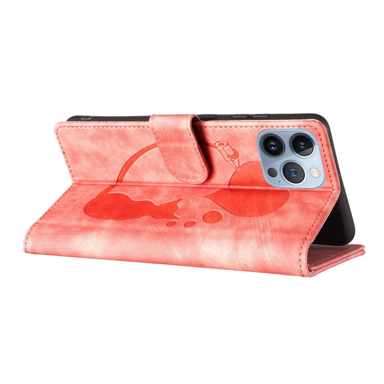 Funda de Cuero para iPhone 13 Pro Pen Heart Cat En Relieve (Naranja)