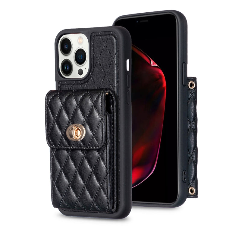 Funda de Cuero Rombico para iPhone 13 Pro con Hebilla de Metal Vertical (Negro)