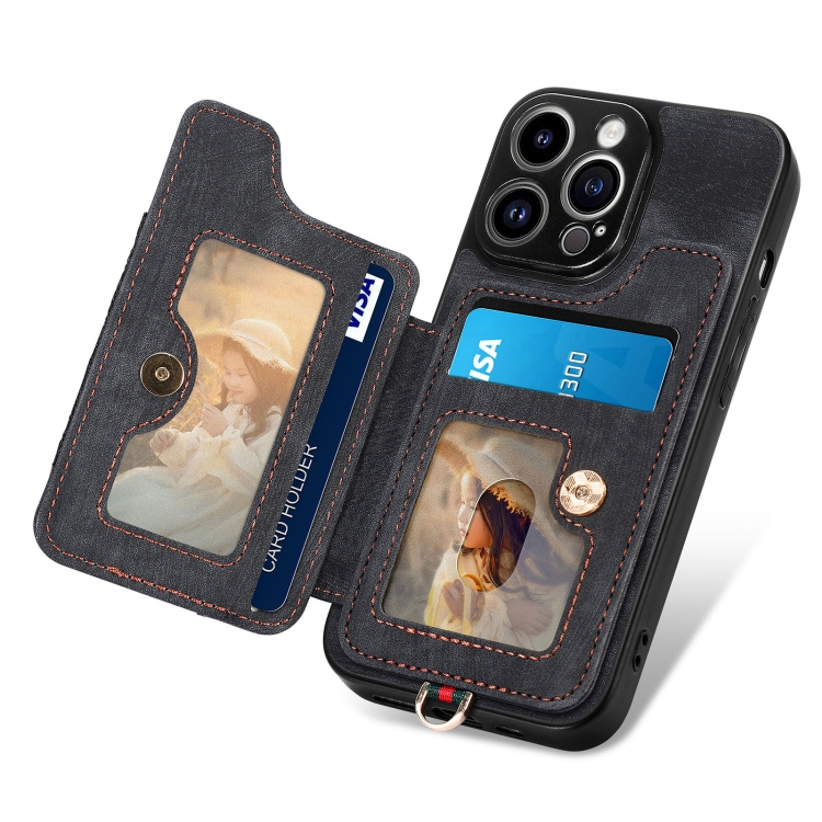 Funda para iPhone 13 Retro Skin-Feel Ring Multi-Card Wallet (Negro)
