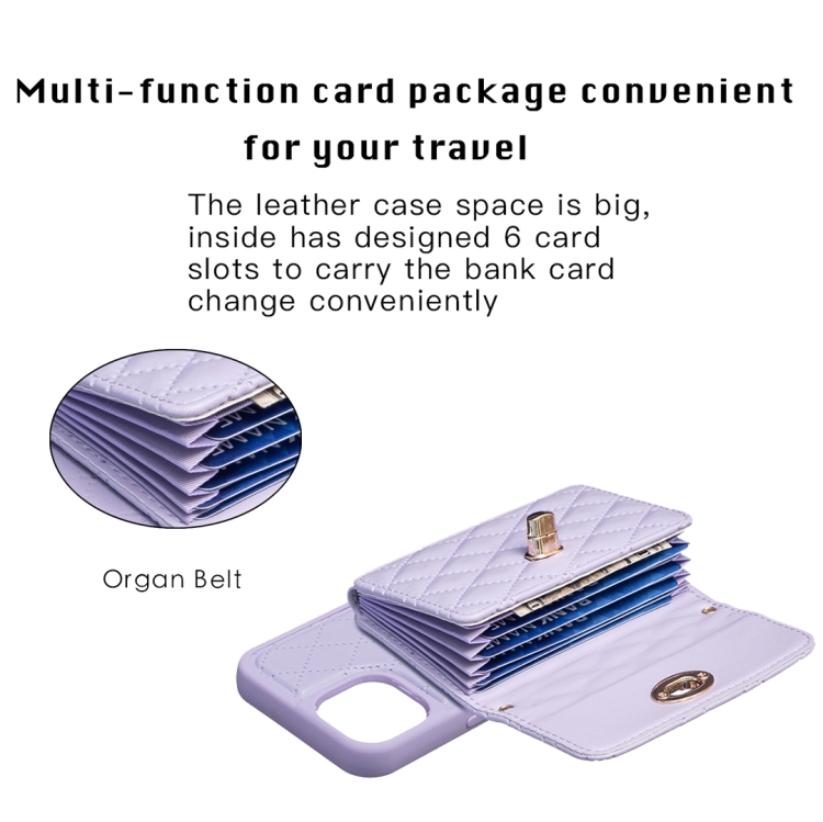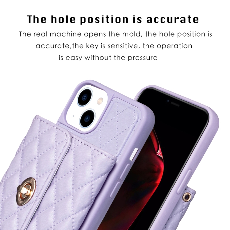 Caja de Teléfono de Cuero Rómbica para iPhone 14 Billetera con Hebilla de Metal Horizontal (Púrpura)