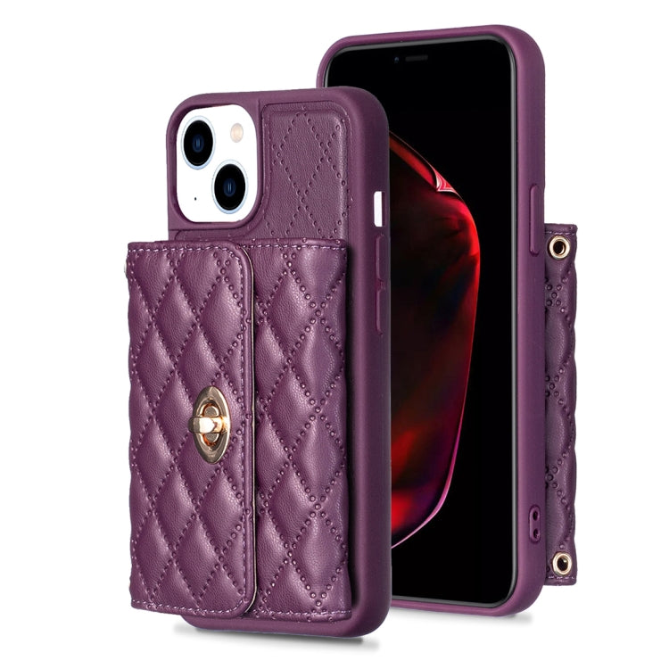 Caja de Teléfono de Cuero Rómbica para iPhone 14 Billetera con Hebilla de Metal Horizontal (Púrpura Oscuro)