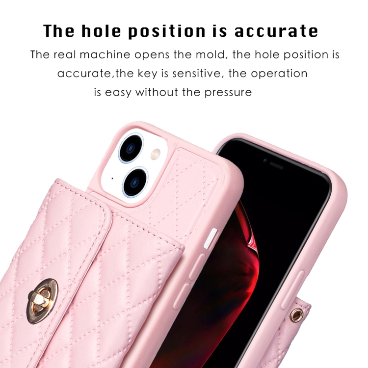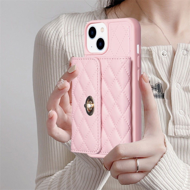 Caja de Teléfono de Cuero Rómbica para iPhone 14 Billetera con Hebilla de Metal Horizontal (Rosa)