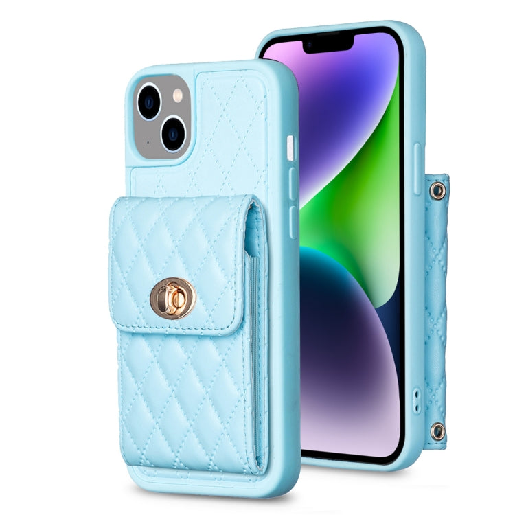 Caja de teléfono de cuero Rómbica para iPhone 14 billetera con hebilla de metal vertical (Azul)