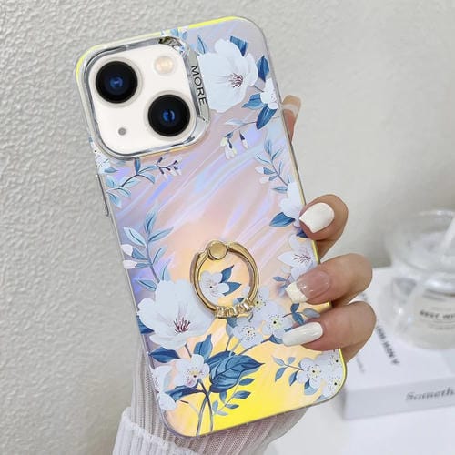 Funda para iPhone 14 TPU con Soporte de Anillo y Flor Láser Galvanoplastia (Flor Blanca Ah10)