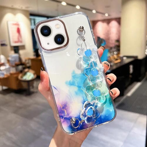 Funda para iPhone 14 con Diseño de Mármol y Halo con Brazalete de Flores (Dorado, Púrpura)