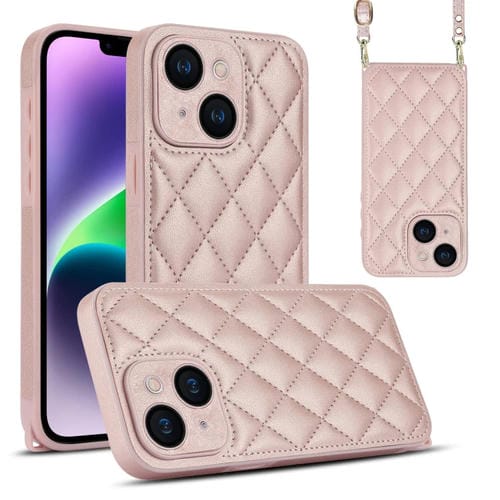 Estuche para Teléfono iPhone 14 con Textura Rómbica y Cordón Doble (Oro Rosa)