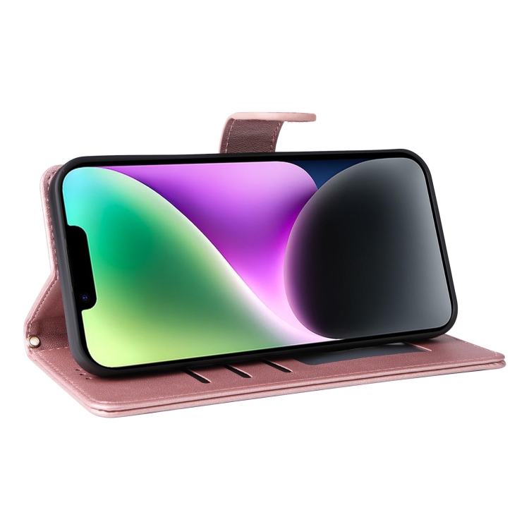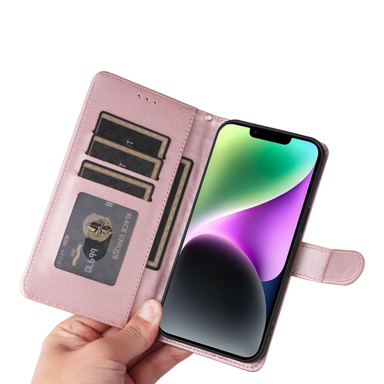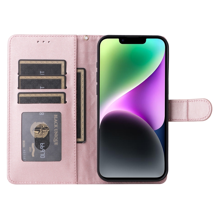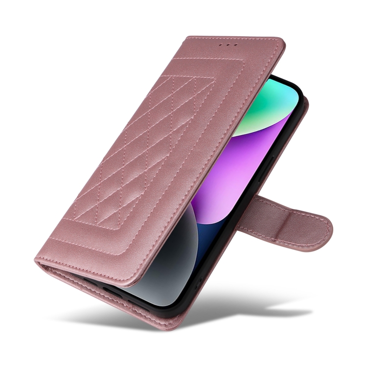 Funda de Teléfono para iPhone 14 con Tapa de Cuero Diamond Lattice (Oro Rosa)