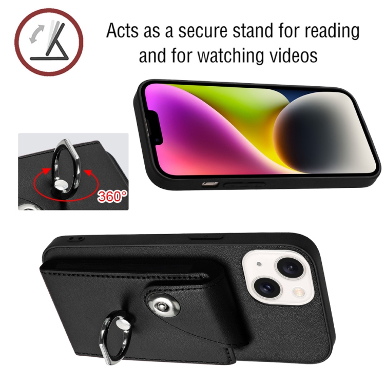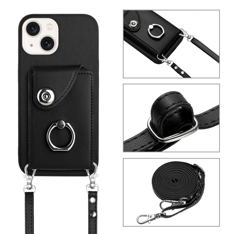 Funda para Teléfono iPhone 14 con Soporte para Anillo y Bolsa para Tarjeta con Cordón Largo (Negro)