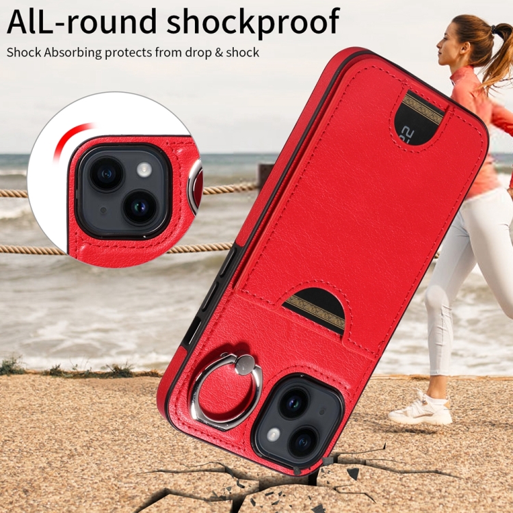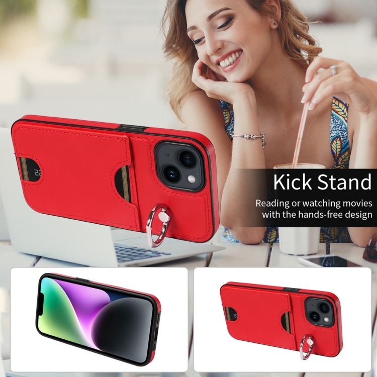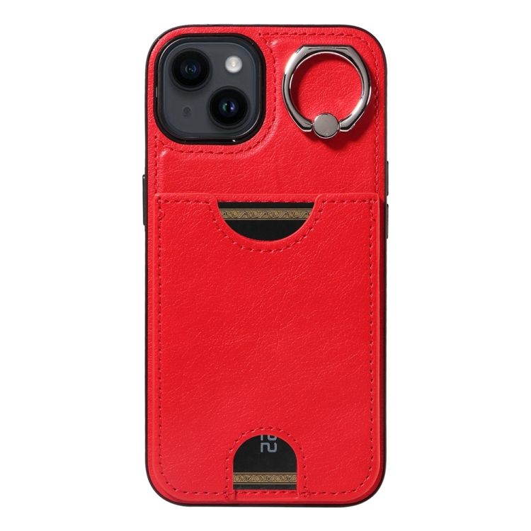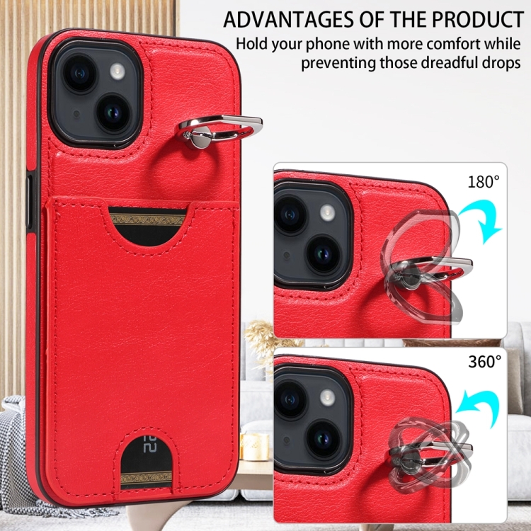 Funda para Teléfono iPhone 14 con Soporte para Anillo y Ranura para Tarjeta con Textura de Becerro (Rojo)
