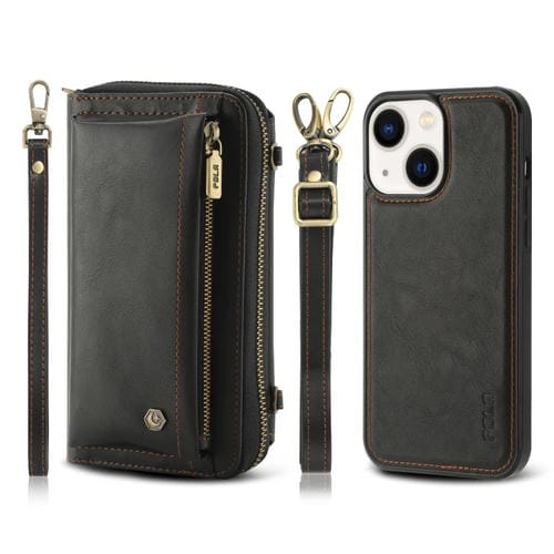Funda para Teléfono iPhone 14 Cuero con Billetera y Cremallera Multifuncional Cruzada (Negro)