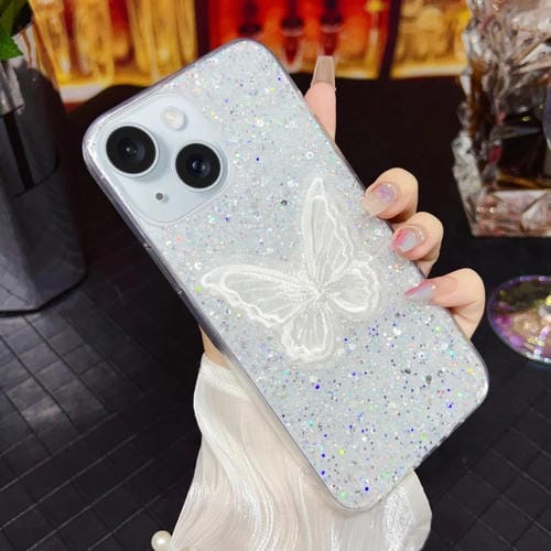 Funda para Teléfono TPU Epoxi iPhone 14 Mariposa Bordada Lentejuelas Estrelladas (Plateado)
