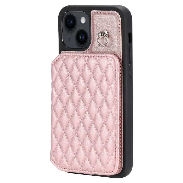 Funda para Teléfono iPhone 14 Grid Texture Card Bag con Cordón (Oro Rosa)