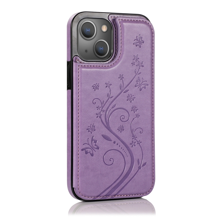 Funda para iPhone 14 Mariposas Flores Doble Hebilla (Púrpura)