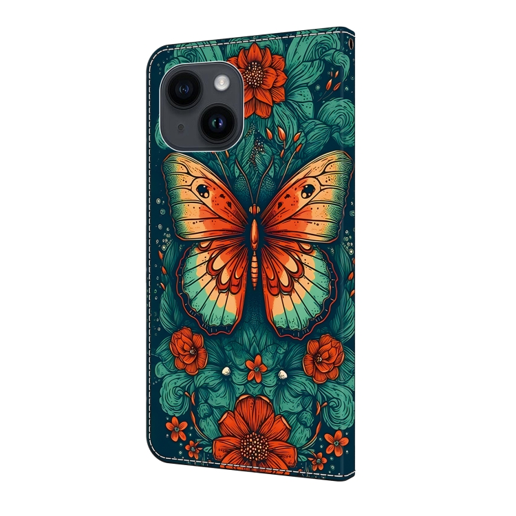 Funda para Teléfono iPhone 14 Plus/15 Plus Cuero Pintado con Cristales Mariposa de Flores