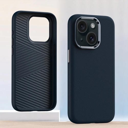 Estuche para Teléfono iPhone 14 Plus Cuero Marco de Lente Metal (Azul)