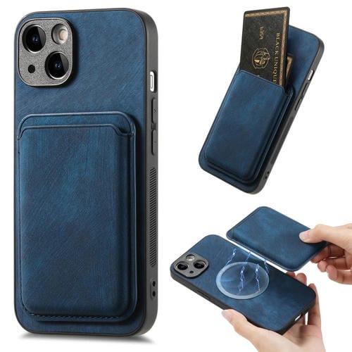 Funda de Teléfono iPhone 14 Plus Magnética con Bolso de Tarjeta de Cuero Retro (Azul)