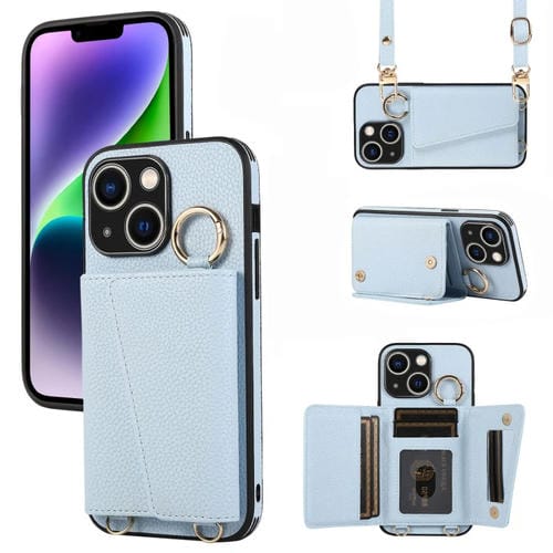 Funda para Teléfono iPhone 14 Plus Contraportada de Cuero con Billetera y Anillo Cruzado (Azul)