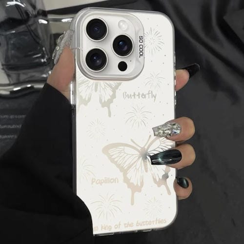 Caja de teléfono híbrida TPU para iPhone 14 Pro Max con pintura plateada (Mariposa hueca blanca)