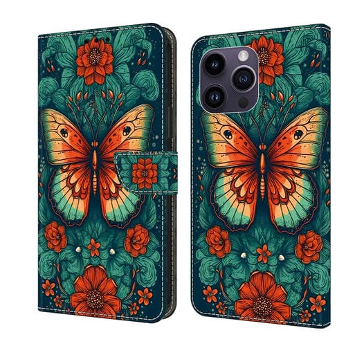 Funda para iPhone 14 Pro Max Cuero Pintada con Cristales Mariposa de Flores