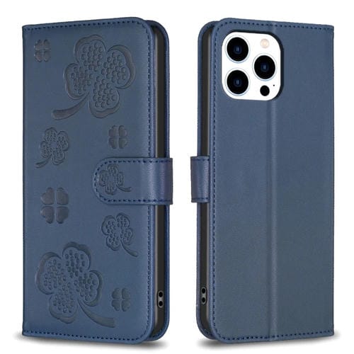 Funda para Teléfono Apple iPhone 14 Pro Max Cuero con Relieve de Cuatro Hojas (Azul)