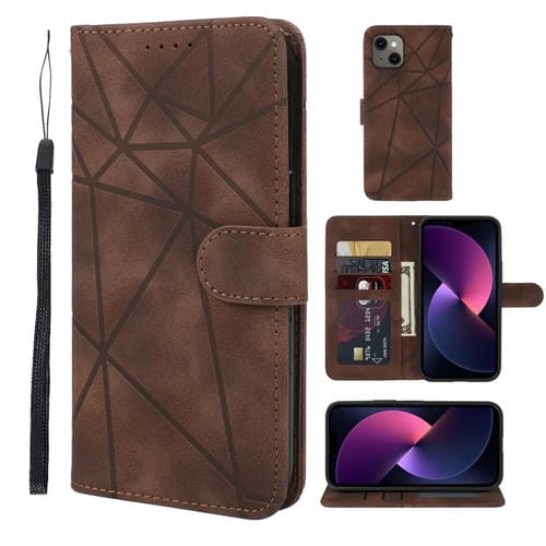 Funda de Cuero para iPhone 14 Skin Feel con Líneas Geométricas (Marrón)