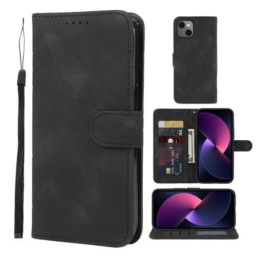 Funda de Cuero para Teléfono iPhone 14 Skin Feel con Líneas Geométricas (Negro)