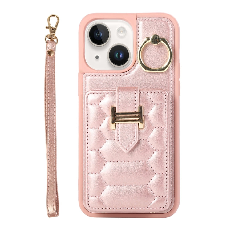 Funda para iPhone 14 Vertical Card Bag Ring Holder con Doble Cordón (Oro Rosa)