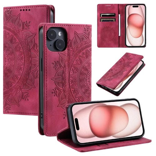 For iPhone 15 Totem Embossed Magnetic Leather Phone Case (Red)