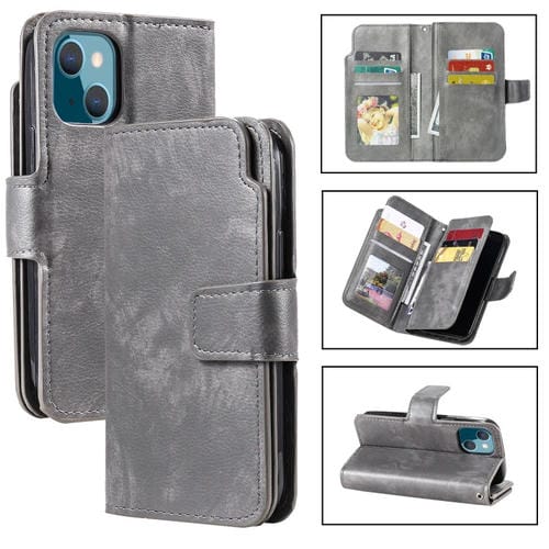 Funda para Teléfono iPhone 15 Cuero con Billetera Triple Plegable para 9 Tarjetas (Gris)