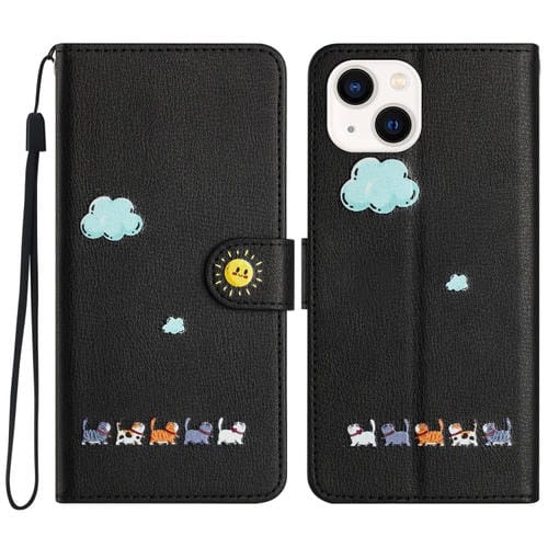 Funda para Teléfono iPhone 15 Cuero Gatos Dibujos Animados (Negro)