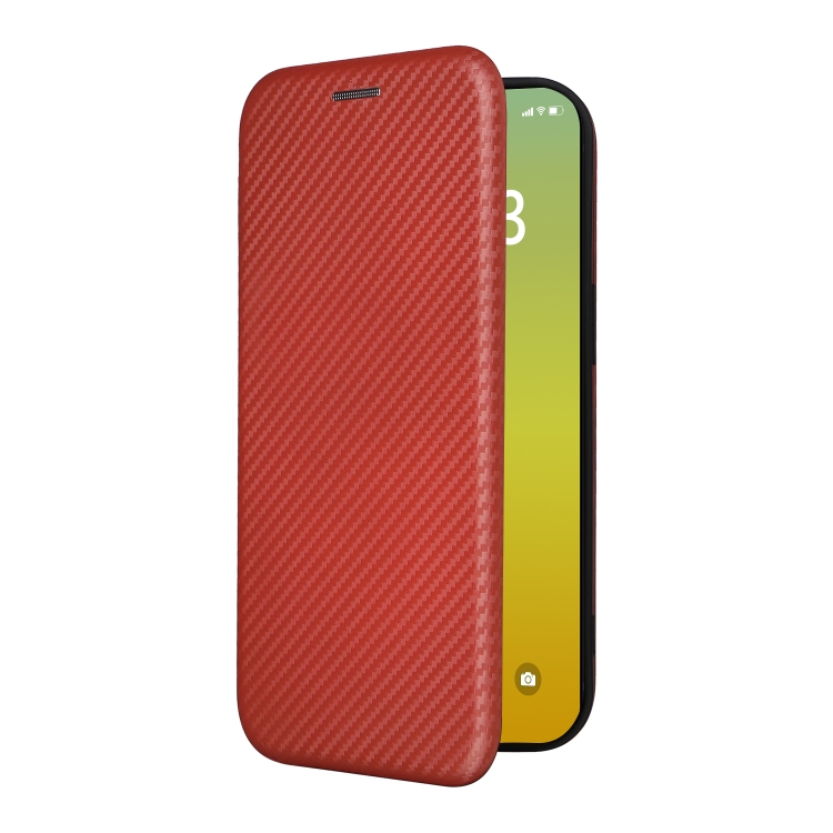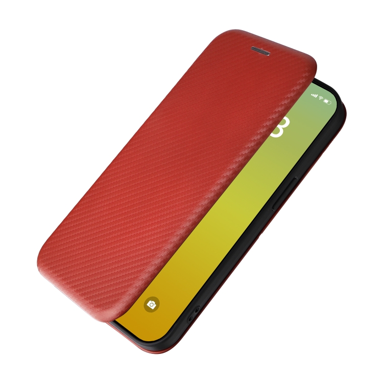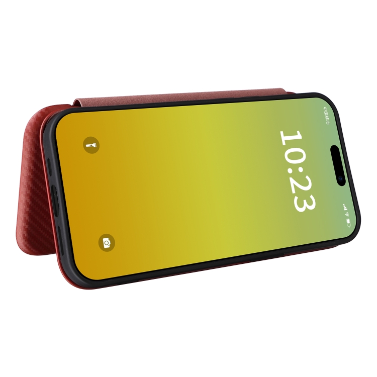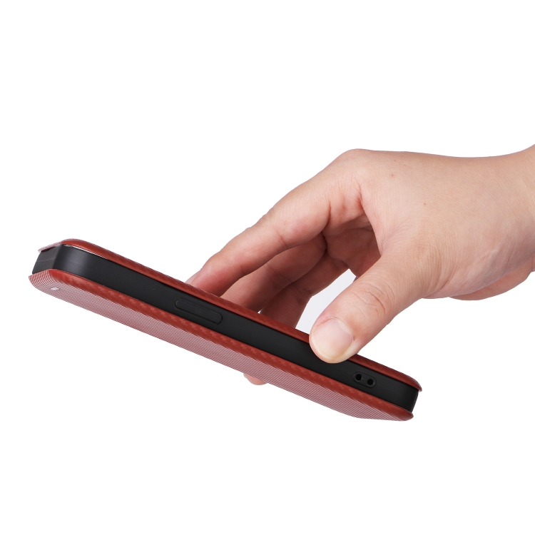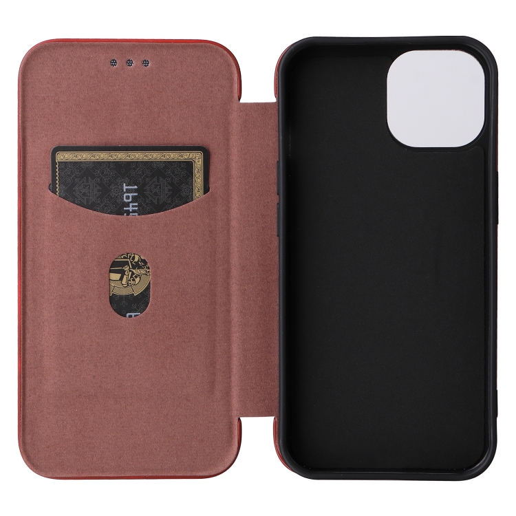Funda de Teléfono iPhone 15 con Tapa de Cuero y Textura de Fibra de Carbono (Marrón)