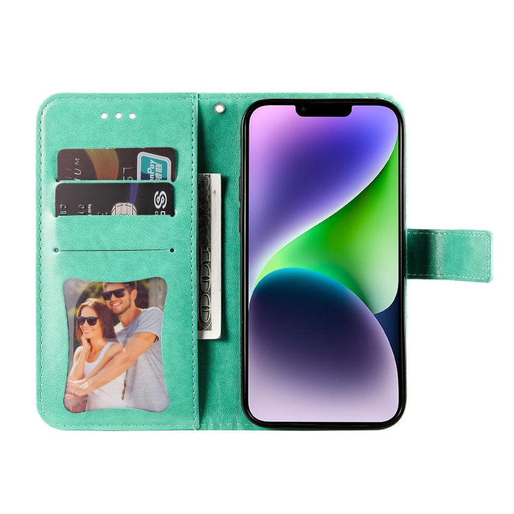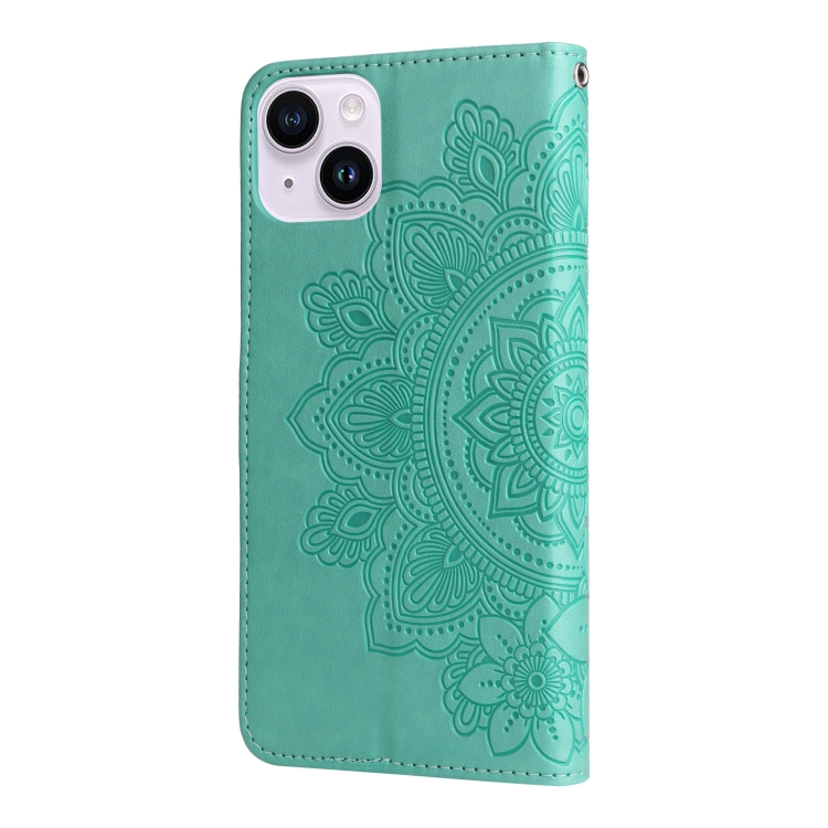 Funda de teléfono iPhone 15 Cuero con Relieve de Flores de 7 Pétalos (Verde)