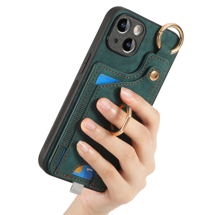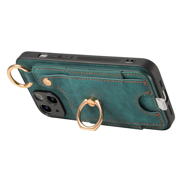 Funda para Teléfono iPhone 15 con Bolsa para Tarjeta y Anillo Sensación de Piel Retro con Lazo para Colgar (Verde)
