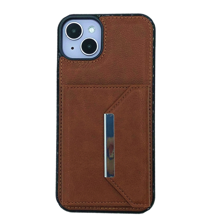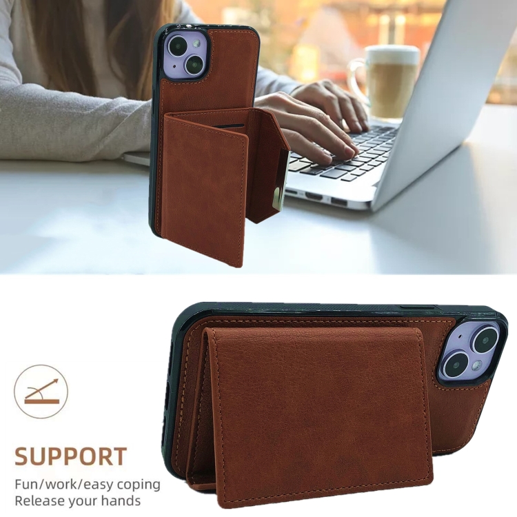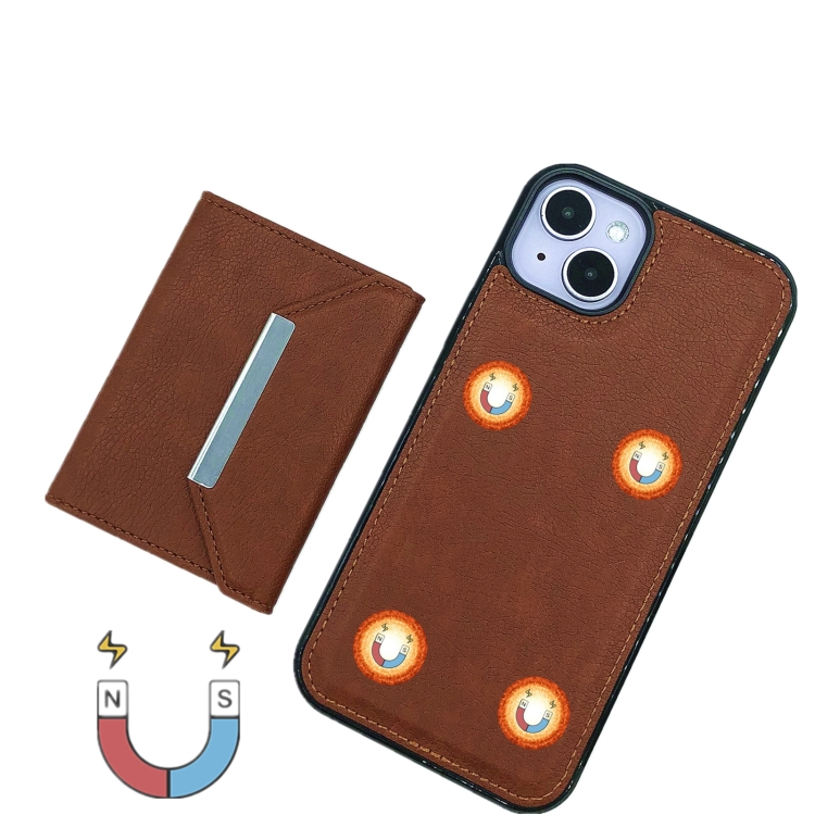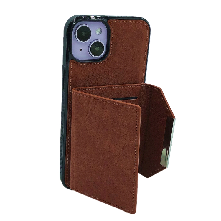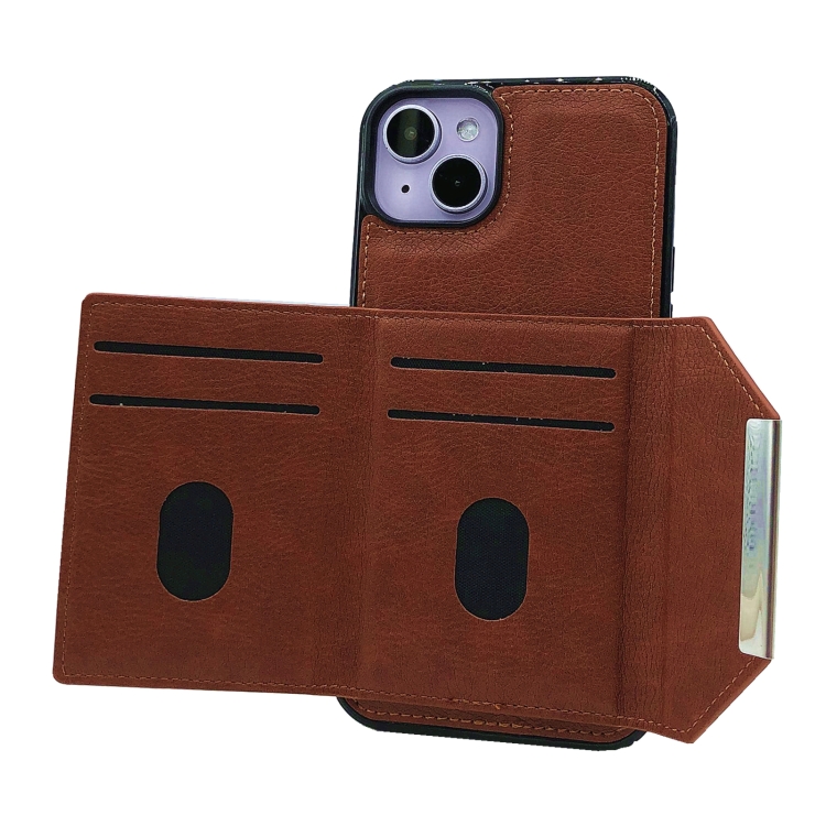 For iPhone 15 Phone Case with Pouch and Card Slots with Solid Color Metal Buckle (Brown)