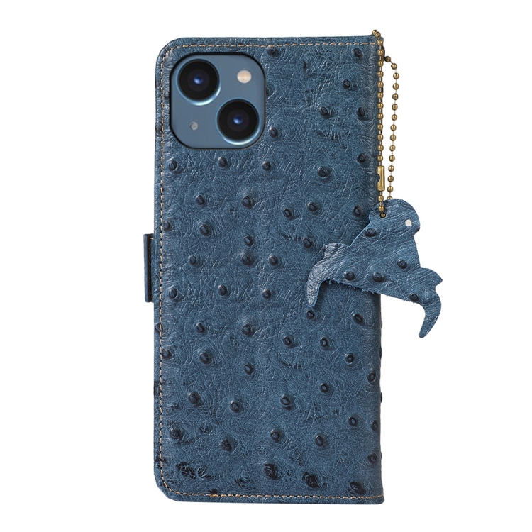 Funda de Teléfono iPhone 15 Patrón de Avestruz Cuero Genuino Rfid (Azul)
