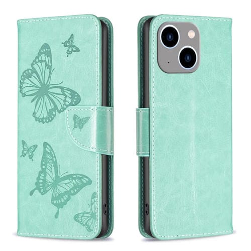 Funda de Cuero para iPhone 15 Plus Estampado en Relieve Dos Mariposas (Verde)