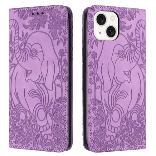 Estuche para Teléfono iPhone 15 Plus Cuero con Relieve de Elefante Retro (Púrpura)