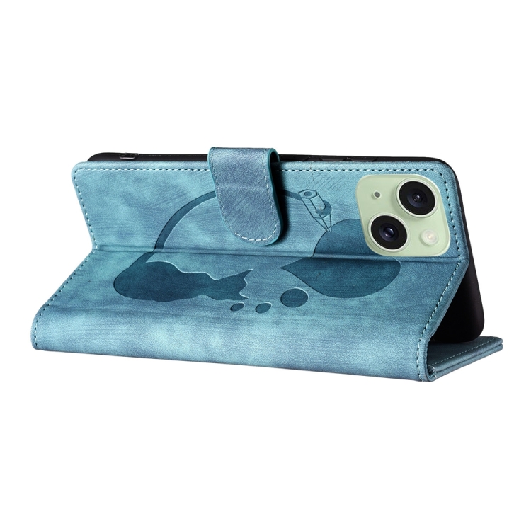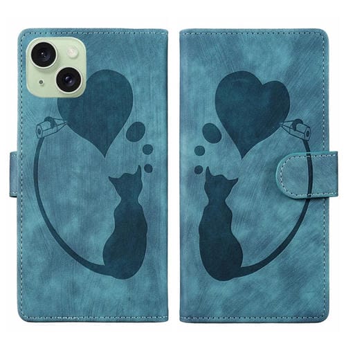 Estuche para Teléfono iPhone 15 Plus Cuero Relieve Gato y Corazón (Azul)